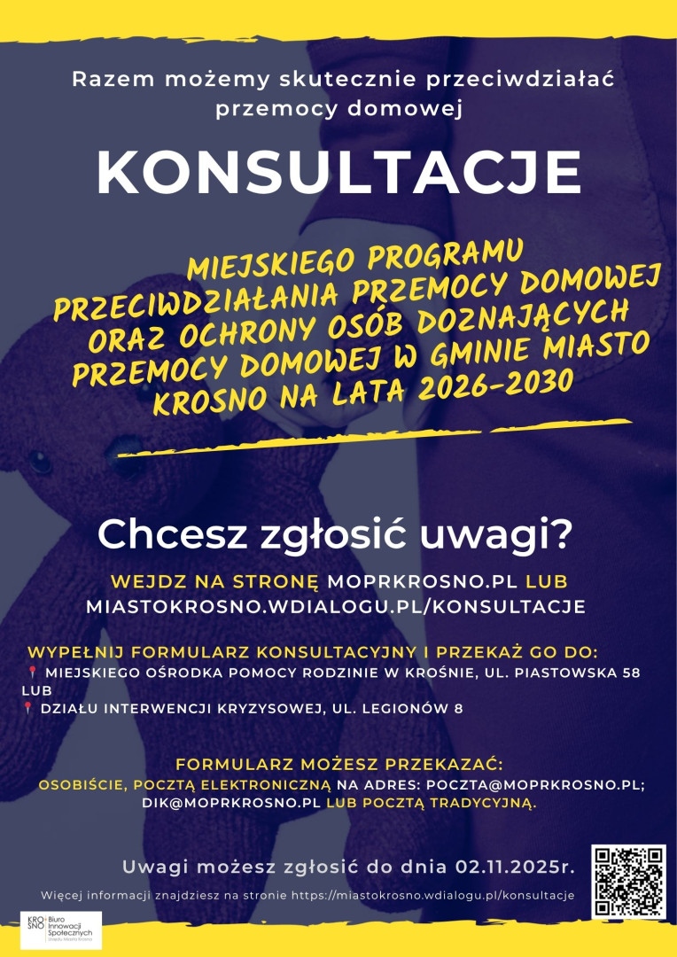 Zebranie propozycji i uwag mieszkańców Gminy Miasta Krosna dotyczących zakresu merytorycznego projektu Miejskiego programu przeciwdziałania przemocy domowej i ochrony osób doznających przemocy domowej w Gminie Miasto Krosno na lata 2026-2030, który ma na celu ograniczenie zjawiska przemocy domowej oraz zwiększenie skuteczności działań w obszarze przeciwdziałania przemocy domowej w Gminie Miasto Krosno.